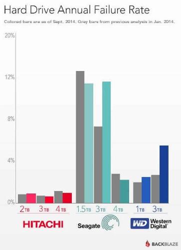 The 3TB Western Digital Red hard drive is doing badly with a failure rate of 8.8 percent on what are basically new drives: the average age is only 6 months. By contrast, the failure rate on Backblaze's 3TB Hitachi Deskstar 5K3000 drives, which have an average age of 2.1 years, is only 0.7 percent.