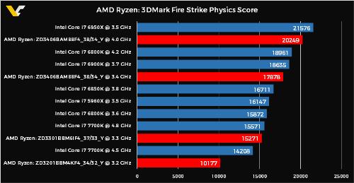 Videocardz revealed the first 3D Mark Fire Strike benchmark for AMD's Ryzen CPUs. While I don't know the actual models, we do know that the AMD Ryzen: ZD3406BAM88F4_38/34_Y is an eight-core CPU, the AMD Ryzen: ZD3301BBM6IF4_37/33_Y is a six-core CPU, and the AMD Ryzen: ZD3201BBM4KF4_34/32_Y is a quad-core CPU. According to the leaked 3D Mark Fire Strike benchmark, AMD's Ryzen eight-core CPU – overclocked at 4Ghz – is almost as fast as Intel's ten-core i7 6950X CPU; a CPU that costs $1700. With its stock clocks, AMD's Ryzen eight-core CPU is almost as fast as Intel's i7 6900K; a CPU that costs $1199