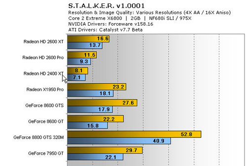 behind the 2600 XT, and as expected the 2400 XT fell in behind the 2600 Pro.