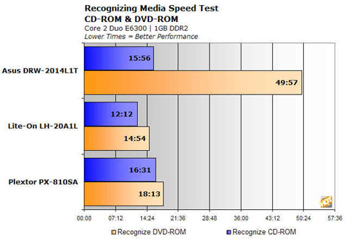 DVD+/-RW Drive Round-up: Plextor, Asus, Lite-On - [hardware] 10:11 AM EST - Dec,21 2007 - post a comment  | | That's not a mistake you see there, nor is it an anomaly. With both Asus drives we received for testing, the average speed for inserting and recognizing a DVD-ROM came out to 49.57 seconds. That means you're waiting nearly a minute before you can access data or watch a movie |